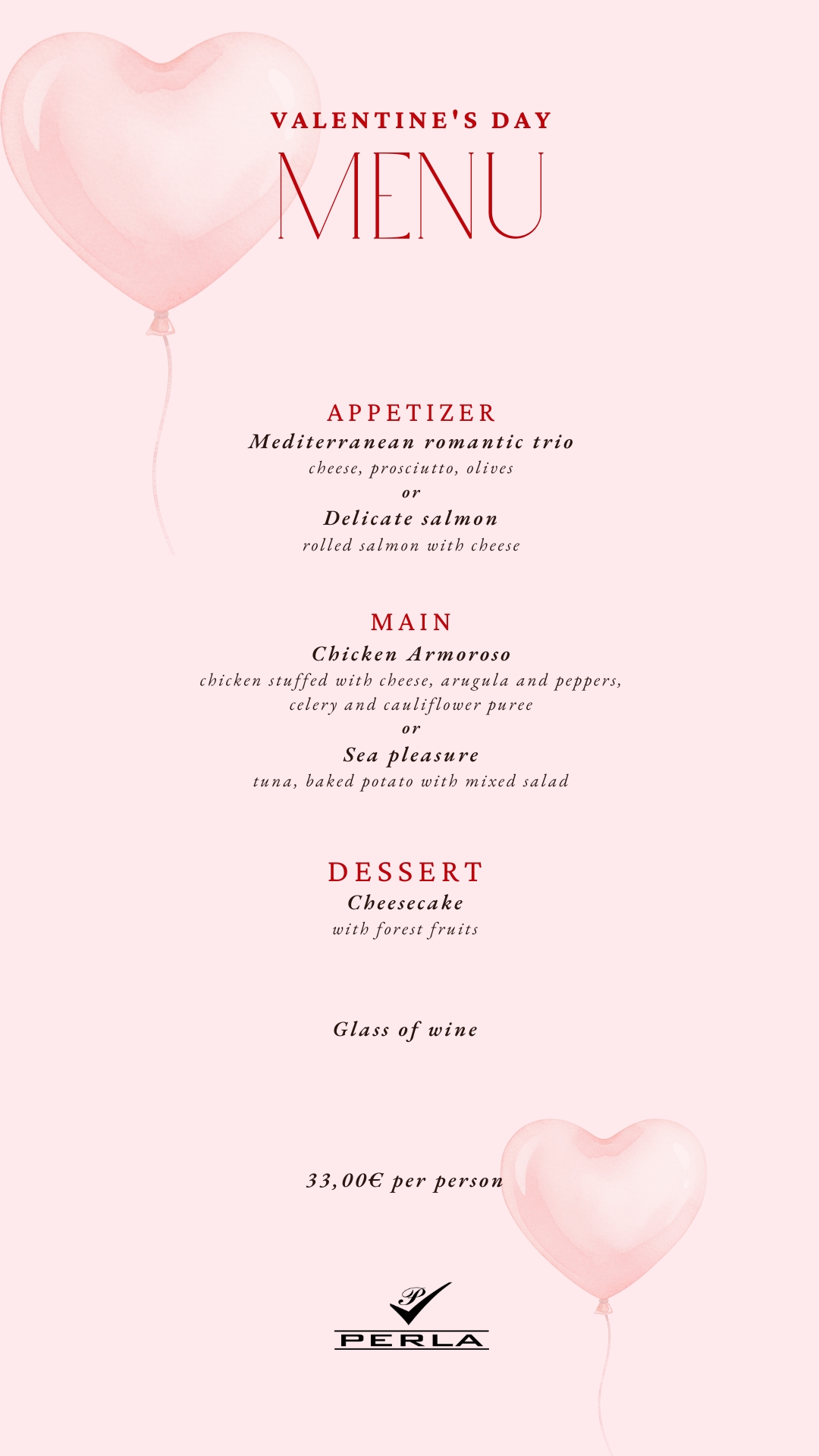 Гостям предлагается праздничное меню с выбором закусок, основных блюд, фирменным десертом и бокалом вина.